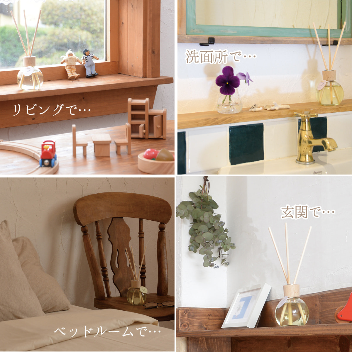 サロン:受付周り、施術スペースの芳香用として、お手洗い